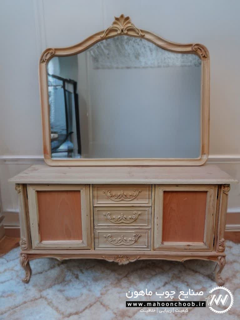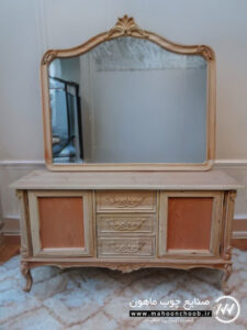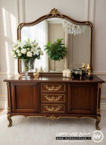 آینه و کنسول سلطنتی کینگ از مدل های کلاسیک و لوکس است و به جهت طراحی شیک و منبت کاری زیبا جز کارهای پرطرفدار مجموعه ی ماهون چوب می باشد.