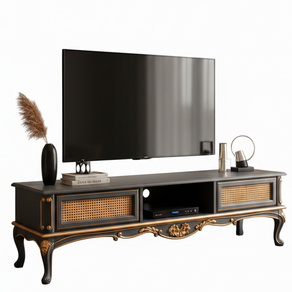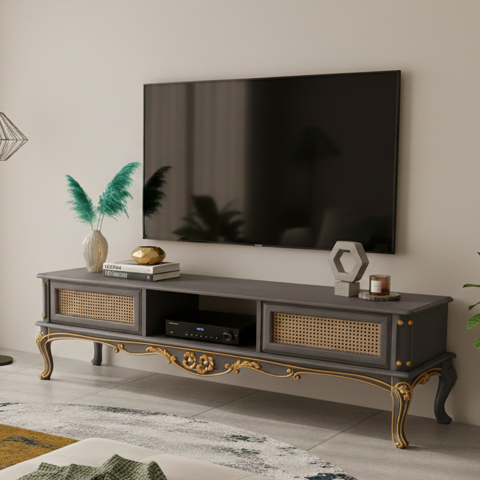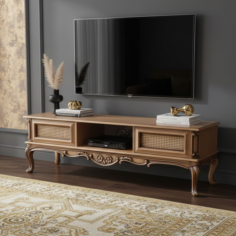 تمام جزئیات ظریف، گلها و نقشهای برجسته و منحصر به فردی که بر روی میز تلویزیون راشل مشاهده میکنید، کاملاً از چوب راش بوده و با مهارت بالایی منبتکاری شدهاند. این ظرافتها، هویت سلطنتی این مدل را شکل میدهند. این منبتها نه تنها از نظر بصری خیرهکننده هستند، بلکه اصالت کار دست را به فضای خانه شما میآورند.